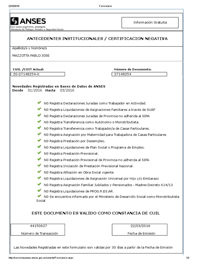 Jamás solicitamos información personal sensible. La certificación negativa obtenida a través de la página web de ANSES no requiere sello o firma de un agente del organismo. Negativa Anses con Cuil La Administración Nacional de la Seguridad Social Anses es el organismo encargado de la seguridad social en Argentina.